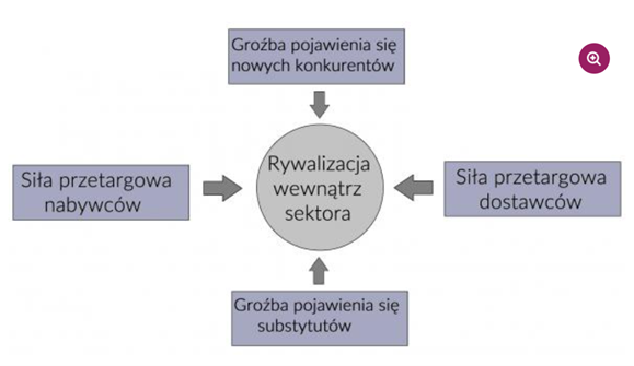 Ta metoda badania rynku jest bardzo konkretna i nakierowana na ocenę pod kątem 5 głównych czynników: rywalizacji między konkurencją, zagrożenia nowymi konkurentami, siła przetargowa klientów, siła przetargowa dostawców oraz zagrożenia płynącego z produktów zastępczych.