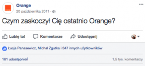 Musisz jednak pamiętać, że przy zadawaniu pytań otwartych (tak jak ma to miejsce w przypadku fanpage’a Orange) prawdopodobieństwo otrzymania negatywnego feedbacku jest wysokie. Zwłaszcza jeśli prowadzisz profil marki w kategorii Usługi.
