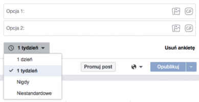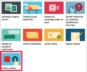 3. Stworzenie ankiety: miesiąc temu Facebook przywrócił możliwość przeprowadzania ankiet przez fanpage’y (do tego momentu przywilej ten miały tylko wydarzenia oraz grupy). Aby to zrobić wystarczy rozwinąć opcję z rodzajami postów na FB i wybrać “Utwórz ankietę”:
