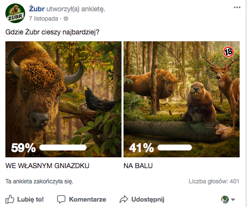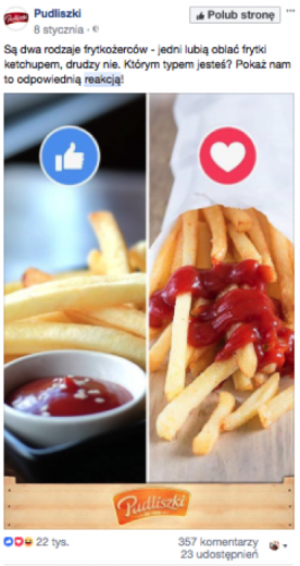 4. Zachęcenie do głosowania poprzez reakcję na Facebooku: reakcje na Facebooku pojawiły się w lutym zeszłego roku i od tamtego momentu cieszą się ogromną popularnością. Warto pamiętać, jaki potencjał kryje się pod tego typu postami – pozyskujemy dzięki nim swego rodzaju badania na temat preferencji fanów, które mogą ułatwić obranie kierunku działań i strategii na planowane kampanie.