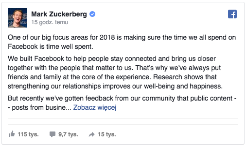 Jak się okazuje część zmian zaczęto wprowadzać jeszcze w 2017 roku, lecz ich kompletna implementacja potrwa jeszcze kilka miesięcy. Niemniej możemy się spodziewać redukcji postów stron w naszym newsfeedzie i wzrostu informacji od naszych znajomych.