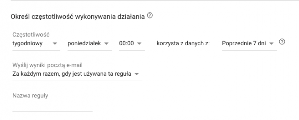 Ostatnim działaniem, które należy wykonać, jest ustalenie tego, kiedy nasza reguła powinna zadziałać. Ważne jest również z jakich danych ma skorzystać nasze narzędzie, aby określić czy podane wcześniej warunki zostały spełnione. W naszym przypadku chcemy, aby było to weryfikowane z początkiem tygodnia.