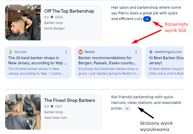 SGE bazuje na najbardziej wiarygodnych stronach internetowych. Dlatego w celu uzyskania widoczności w tym segmencie, należy dodatkowo być widocznym w lokalnych serwisach z zestawieniami oraz rankingami. W przypadku barberów w New Jersey, jest to portal NJ czy też Best Things NJ. W celu zweryfikowania danych, na podstawie których opierają się wyniki Search Generative Experience, kliknij strzałkę umożliwiającą rozwinięcie informacji.