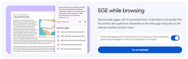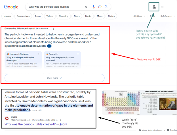 Gdy już aktywujesz podstawową opcję generatywnego wyszukiwania i klikniesz Try an example, zostaniesz przekierowany do testowego wyniku SGE.