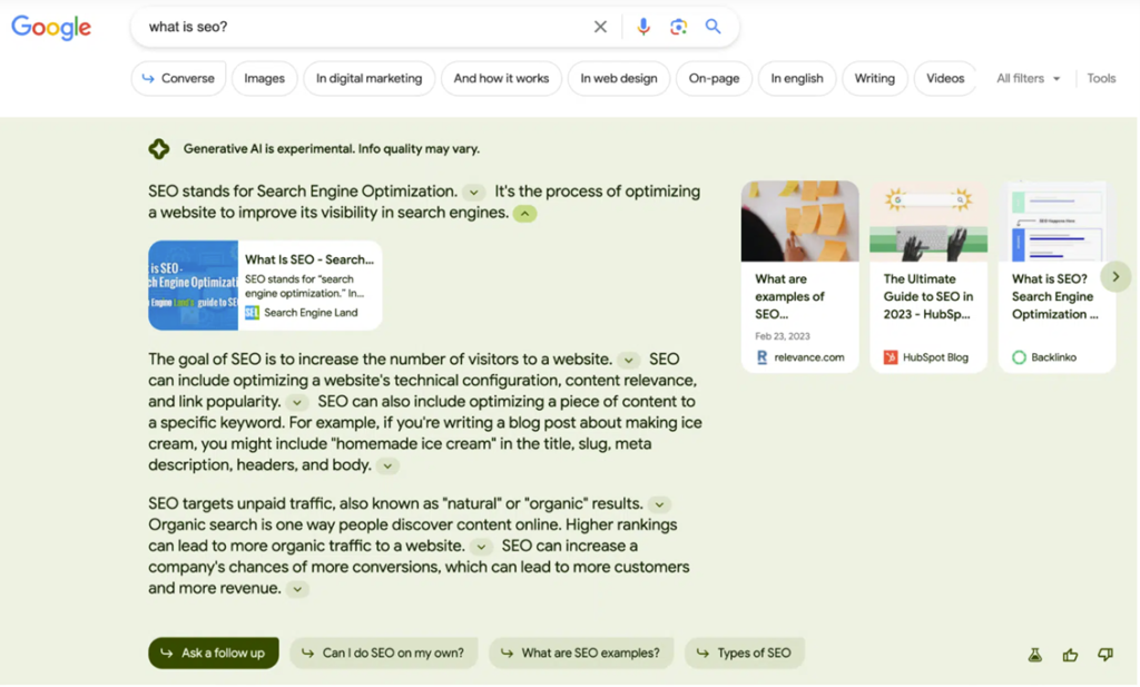 Search Generative Experience to określenie odpowiedzi generowanych przez model językowy i wyświetlanych na górze wyników wyszukiwania Google – bez konieczności wchodzenia w jakikolwiek link.